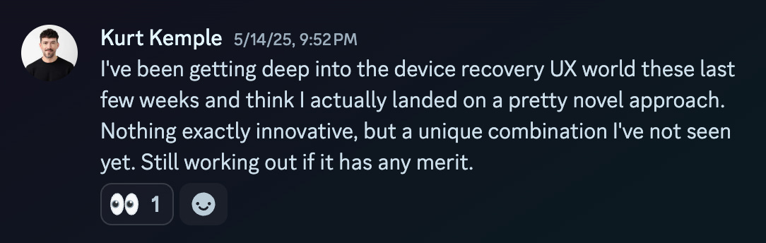 That night, I posted to our friend group in Discord: “I’ve been getting deep into the device recovery UX world these last few weeks and think I actually landed on a pretty novel approach. Nothing exactly innovative, but a unique combination I've not seen yet.”